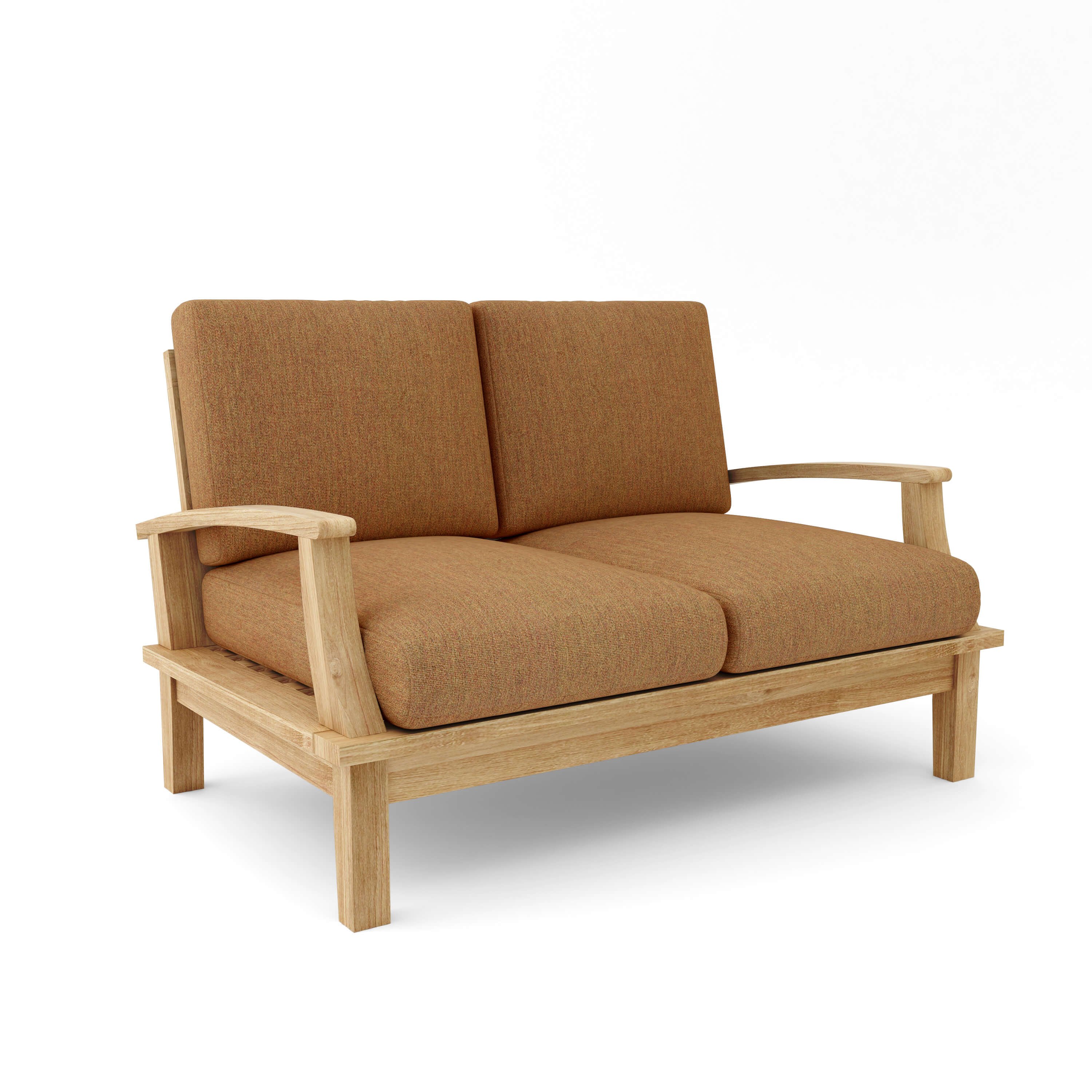 The Brianna Deep Seating Loveseat with seating for two is the perfect addition for your teak patio furniture. With its comfortable teak design and thick wood frame, you can be sure to entertain guests, family, and friends over a good chat. Add other pieces such as ottomans, coffee tables, or mix and match with other pieces of the Brianna Deep Seating Collection to create your ideal set. Includes Sunbrella All-Weather cushions 27” deep and 6” thick saturated with UV stable pigments that resist color fade, water, mold and mildew. Fabric pattern and color options available. Made with kiln-dried, Premium Teak wood, the chair is sanded smooth without finish in its natural form and color.